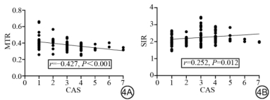 相关性分析显示,CAS与MTR呈低度负相关(r=-0.427,P<0.001)(图4A),与SIR呈弱正相关(r=0.252,P=0.012)(图4B)。