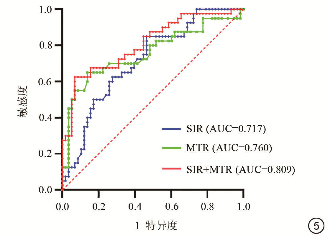 ROC曲线分析显示,以MTR≤0.40判断 TAO处于活动期,其效能最优(曲线下面积0.760,敏感度65.0%,特异度86.2%);以SIR≥2.27判断TAO处于活动期,其效能最优(曲线下面积0.717,敏感度53.4%,特异度85.0%);联合MTR及SIR时,诊断效能进一步提高(曲线下面积0.809,敏感度62.5%,特异度93.1%)。与单独应用SIR比较,曲线下面积差异具有统计学意义(0.809 vs. 0.717,Z=2.35,P=0.019)(图5)。