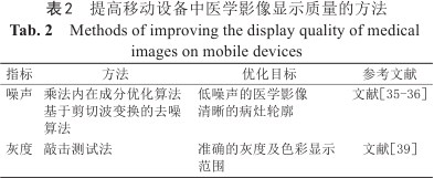 为了提高移动设备中医学影像的显示质量,可以在服务器端先对图像进行预处理,再传输到移动端进行显示。表2列出了可以优化移动设备显示效果的方法。其中,为了提高医学图像的清晰度,可以采用去噪方法。比如,Wu等[38]在服务器端通过乘法内在成分优化算法对医学影像进行降噪和预分割,将病灶边缘更加清晰的图像传输到移动设备上,进而在计算性能有限的移动设备中完成分割操作;Hu等[39]则通过剪切波变换算法进行图像去噪,提高了医学影像在移动设备中的显示质量。去噪后的医学影像病灶区域和正常组织之间的界限更清晰,这为后续的分割操作提供了更高质量的图像,既节省了医生的处理时间又提高了分割精度。