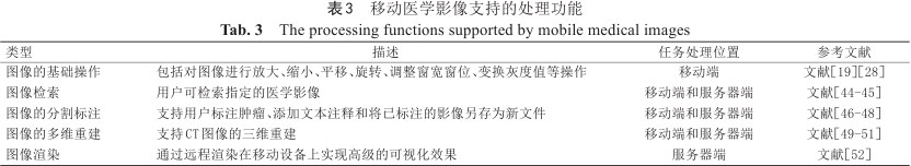 移动端医学影像应用程序已具备辅助诊断和管理患者数据的能力[46],即移动设备可以提供和专业桌面工作站同样丰富的功能。如表3所示,目前大多数移动医学影像支持的功能包括以下五类:基础操作、图像检索、分割标注、多维重建以及图像渲染。