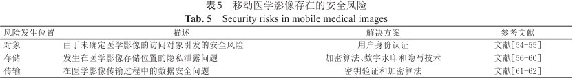 随着移动设备越来越多地被应用在医学影像领域,用户群体复杂、存储和传输环境不确定等因素也带来了新的安全问题。因此,需要制订相应的安全策略来保障医学影像数据在移动端传输、存储和使用过程中的安全。表5根据风险发生位置,将数据安全与隐私问题分为对象、存储和传输三类[61]。