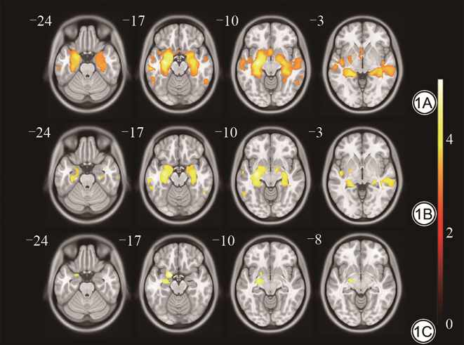 基于MATLAB 2020a,使用SPM 12软件对T1加权像进行头动校正的预处理。采用基于体素的形态学测量(voxel-based morphometry, VBM)方法,使用SPM 12的CAT 12工具包对预处理后的图像进行分割,获得所有被试的灰质、白质、脑脊液图像和颅内总容积(total intracranial volume, TIV)。使用8 mm半高全宽各向同性高斯平滑核对分割后的灰质图像进行平滑处理,用SPM 12软件的统计分析模块,将性别、年龄、受教育年限和TIV作为协变量,对三组被试平滑后的灰质图像进行单因素方差分析和组间两两比较。ZHOU等[11]手工勾画的POC图像做掩膜,用同样的方法对三组被试进行单因素方差分析和组间两两比较。