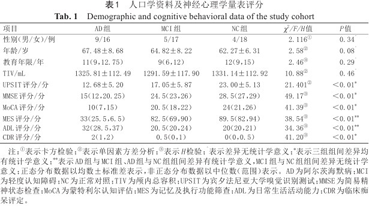注:①表示卡方检验;②表示单因素方差分析;③表示H检验;^表示差异无统计学意义;*表示三组组间差异均有统计学意义;**表示AD组与MCI组、AD组与NC组组间差异有统计学意义,MCI组与NC组组间差异无统计学意义;正态分布数据以均数±标准差表示,非正态分布数据以中位数(范围)表示。AD为阿尔茨海默病;MCI为轻度认知障碍;NC为正常对照;TIV为颅内总容积;UPSIT为宾夕法尼亚大学嗅觉识别测试;MMSE为简易精神状态检查;MoCA为蒙特利尔认知评估;MES为记忆及执行功能筛查;ADL为日常生活活动能力;CDR为临床痴呆评定。