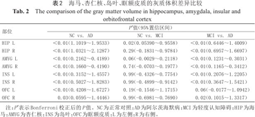 注:P*表示Bonferroni校正后的P值。NC为正常对照;AD为阿尔茨海默病;MCI为轻度认知障碍;HIP为海马;AMYG为杏仁核;INS为岛叶;OFC为眶额皮质;L为左侧;R为右侧。