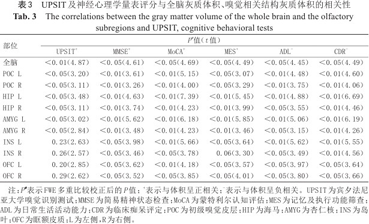 本研究中岛叶、眶额皮质的灰质体积与认知水平呈正相关,而与UPSIT评分无相关。这可能与研究样本量较小、存在统计学误差有关,有待进一步研究。