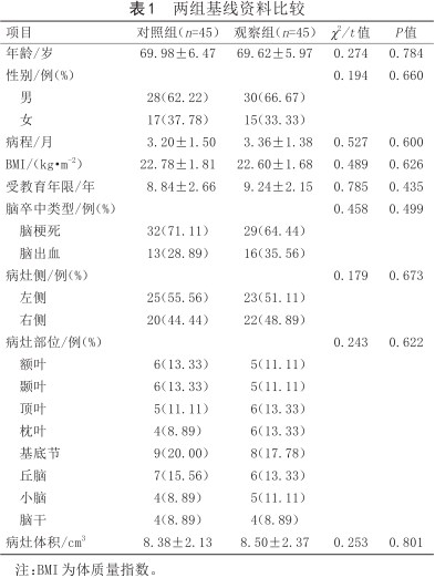 两组年龄、性别、病程、体质量指数(body mass index, BMI)、脑卒中类型、受教育年限及病灶侧、病灶部位及病灶体积差异无统计学意义(P>0.05),见表1。