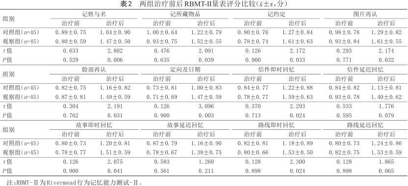 治疗前,两组患者RBMT-Ⅱ量表评分差异无统计学意义(P>0.05);治疗后,观察组患者RBMT-Ⅱ量表中记姓与名、记所藏物品、记约定、图片再认、脸部再认、定向及日期、信件即时回忆、故事即时回忆以及路线即时回忆评分高于对照组,差异具有统计学意义(P<0.05),见表2。