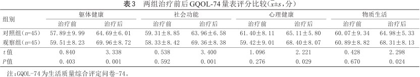 治疗前,两组GQOL-74量表评分差异无统计学意义(P>0.05);治疗后,观察组躯体健康、社会功能、心理健康及物质生活评分均高于对照组,差异具有统计学意义(P<0.05),见表3。