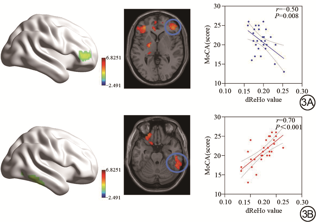采用DPABI统计分析模块进行统计学分析,对照组、MHE组分别行单样本t检验,再采用双样本t检验对MHE组与对照组的dReHo进行统计,性别、年龄、受教育年限、头动作为协变量,使用高斯随机场(Gaussian random field corrected, GRF)校正方法(体素水平P<0.001,团块水平P<0.05),并提取两组之间存在显著差异脑区的dReHo值与NCT-A评分、DST评分、MoCA评分进行Pearson相关性分析。双侧检验,检验水准为α=0.05。