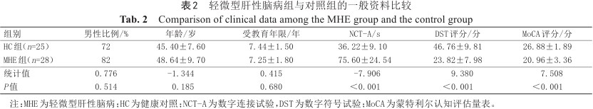 最终共纳入28名MHE患者与25名健康志愿者(对照组),MHE患者组与对照组的一般资料(性别、年龄、受教育年限)差异均无统计学意义(P>0.05),而两组的NCT-A、DST及MoCA量表评分方面均存在显著差异(P<0.05),见表2。
