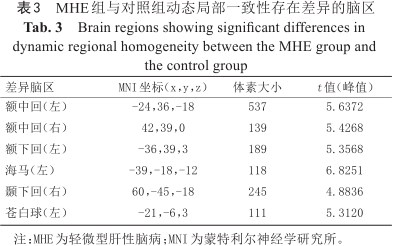 对照组、MHE组分别行单样本t检验后各组的dReHo变异性的分布模式如下:在对照组中,dReHo变异性相对较大的区域包括前额叶皮层、顶-颞交界处和颞极;在MHE组中,前额叶皮层、顶-颞交界处和颞叶区dReHo变异性高于对照组;见图1。与对照组相比,MHE组左侧额中回、额下回、苍白球、海马、右侧额中回以及颞下回脑区的dReHo升高,差异均具有统计学意义(GRF校正,体素水平P<0.001,团块水平P<0.05);见图2、表3。