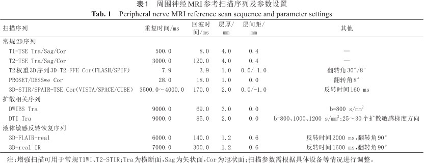 鉴于不同的单位临床特色和需求、不同厂家的扫描仪工作特点均存在差别,故无法做到绝对一致的扫描方案和推荐参数。下面以3.0 T磁共振扫描仪为参考,列举常见的周围神经成像扫描方案,扫描参数及序列设置应根据临床实际情况、患者配合程度以及设备特点等进行调整。在条件合适的情况下,推荐增加T1、T2权重的增强扫描。