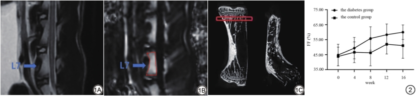 采用定量非对称回波的最小二乘估算法迭代水脂分离序列(iterative decomposition of water and fat with echo asymmetry and least-squares estimation quantitation sequence, IDEAL-IQ)联合计算机显微断层扫描(micro computed tomography, Micro-CT)技术评估兔1型糖尿病腰椎骨髓脂肪含量和骨小梁微结构相关性。