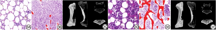 采用SPSS 26.0统计软件(IBM, Armonk, NY),计量资料使用Shapiro-Wilk检验进行正态性检验,若符合正态分布,表示为平均值±标准差(±s)。不同时间点腰椎IDEAL-IQ FF差异比较采用重复测量方差分析;同一时间点组间FF、Micro-CT骨小梁形态计量学参数、组织病理学参数差异比较采用独立样本t检验或Mann-Whitney U检验;采用Pearson相关系数评估骨髓FF与骨小梁形态计量学参数、组织病理学参数相关性。P<0.05为差异具有统计学意义。