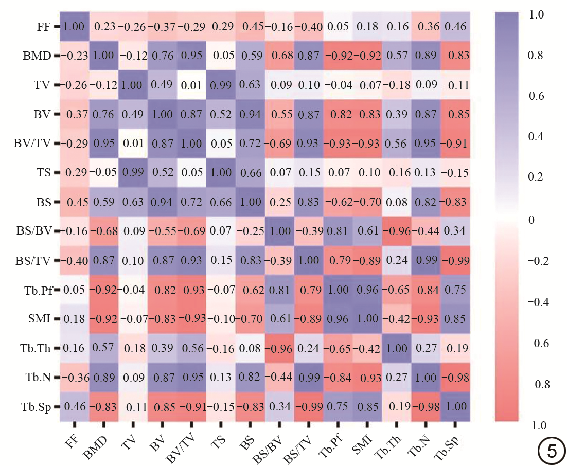 | 骨小梁模式因子/mm-1 | 4.629±1.304 | 3.766±1.368 | -1.192 | 0.256 |