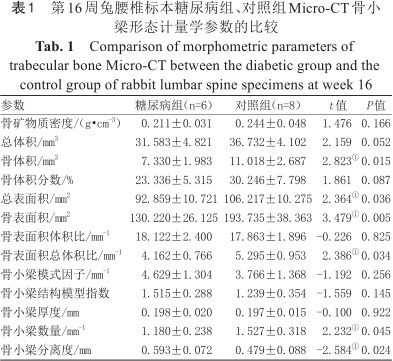 第16周兔腰椎标本糖尿病组、对照组Micro-CT骨小梁形态计量学参数的比较