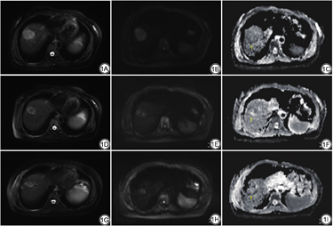MRI有良好的组织和空间分辨率,能清晰显示肝癌与周围组织的关系,在肝癌诊断及疗效评估中发挥着重要作用[22]。研究结果表明,简易MRI平扫(敏感度和特异度分别为86%和94%)与对比剂增强扫描(敏感度和特异度分别为87%和94%)显示肝癌作用相仿,超声的敏感度低于简易MRI(53% vs. 82%)[23]。DWI是一种能够反映组织微结构成分的技术。ADC用于量化水分子在组织中的随机运动[24]。ADC值越大,表示水分子的扩散速度越快。肿瘤组织的细胞密度增加,体积增大,肿瘤细胞内的纤维基质及细胞器的异质性也导致细胞内水分子扩散受限,使得ADC值降低。另外由于活性程度高的肿瘤细胞膜完整,能限制水分子运动,从而使ADC值减低;反之,ADC值升高[25]。