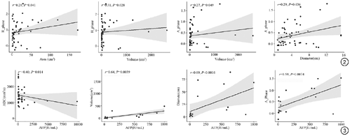 Spearman相关性分析显示,A phase的SER与肿瘤形态呈轻度正相关(P<0.05),即随着肿瘤的缩小,其强化程度降低,与肿瘤体积和最大长径的相关系数分别为0.27、0.29(图2);H phase的SER亦与肿瘤形态呈轻度正相关(P<0.05),面积和体积的相关系数分别为0.28、0.31(图2);ADC值与肿瘤标志物AFP值呈负相关(r=-0.40,P<0.05),即随着ADC值的升高,AFP值降低(图3);AFP与肿瘤的体积和直径呈正相关(r=0.64、0.69,P均<0.05);同时,AFP与A phase的SER呈正相关(r=0.59,P<0.05)(图3),而与H phase和V phase的SER无明显相关性(P>0.05)。