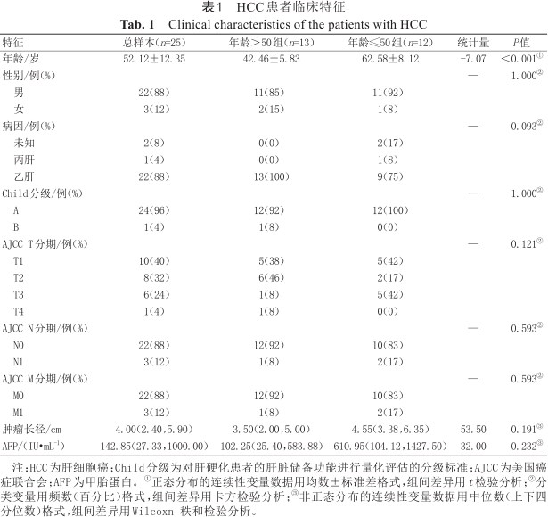 研究最终纳入25例HCC患者病例,其中男22例,女3例,年龄32~75(53.08±11.32)岁。25例HCC患者如期完成HIT治疗。患者的一般临床资料除年龄外,差异均无统计学意义(P>0.05),详见表1。