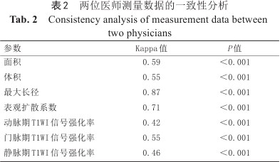 两位医师测量HIT治疗前后肿瘤形态学参数(面积、体积、最大长径)和MRI功能学参数(ADC、三期SER)数据一致性较好,详见表2。