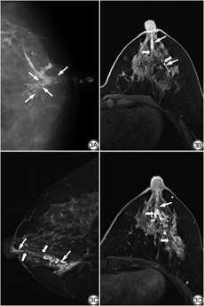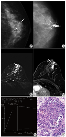 GL采用GE Senographe DS全视野数字系统乳腺机,用1.8倍放大装置摄取头尾位、内外斜位和侧位。摄片前经溢液的输乳孔注入“碘佛醇注射液”(中国,江苏恒瑞医药股份有限公司),注药量为患乳稍有胀痛感即停止注药,通常为0.20~2.00 mL。MRI采用Siemens 1.5 T Avanto(德国)和SIEMENS MAGNETOM SKYRA 3.0 T(德国)MR扫描仪,分别为原机自带的4通道和18通道乳腺专用线圈,2个机器采用同样的扫描序列,平扫采用快速自旋回波T1WI、T2WI脂肪抑制横轴位及矢状位;扩散加权成像(diffusion-weighted imaging, DWI)采用单次激发自旋平面回波序列,b值800 s/mm2;动态对比增强MRI(dynamic contrast-enhanced MRI, DCE-MRI)由高压注射器经手背静脉以团注方式注入Gd-DTPA(中国,广州康臣药业有限公司),剂量为0.15 mmol/kg,流率3.00 mL/s,并同时注射等量生理盐水,即刻进行扫描,连续采集6个时相,第一时相扫描时间为90 s,以后单期扫描时间为60 s。