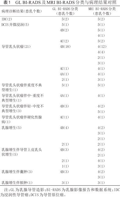 GL BI-RADS及MRI BI-RADS分类与病理结果对照
