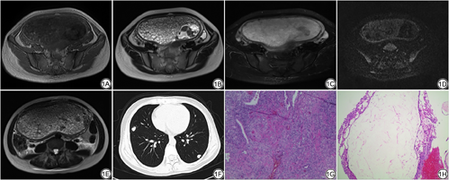 孕16周盆腔MRI检查示:(1)宫腔偏右侧占位,大小约为16.1 cm×7.2 cm×17.7 cm,病灶呈“蜂窝状”改变,T1加权像(T1-weighted image, T1WI)为稍低、等及稍高信号,T2加权像(T2-weighted image, T2WI)为稍高及稍低信号,扩散加权成像(diffusion-weighted imaging, DWI)序列呈等及稍低信号,子宫蜕膜层及结合带清晰、连续,子宫肌壁内未见明确异常信号灶;(2)宫腔单胎、头位,胎儿位于宫腔左侧,以上考虑为双胎妊娠完全性葡萄胎与胎儿共存(图1A~1D)。18周复查盆腔MRI示:盆腔偏右侧占位较前范围增大(18.5 cm×9.2 cm×21.7 cm),病灶局部与子宫右侧壁分界欠清,考虑完全性葡萄胎进展(图1E)。头颅MRI未见异常。给予诊断性抗感染治疗后咳嗽、咳痰改善不明显,经患者及家属同意后行胸部计算机断层扫描(computed tomography, CT)检查示双肺多发实性结节,多考虑转移瘤(图1F)。