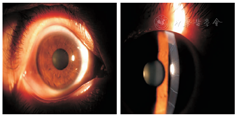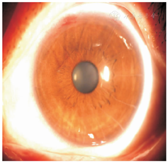 角膜中央约3 mm区域透明,角膜中周部可见16条线状、放射状角膜瘢痕,深达基质层