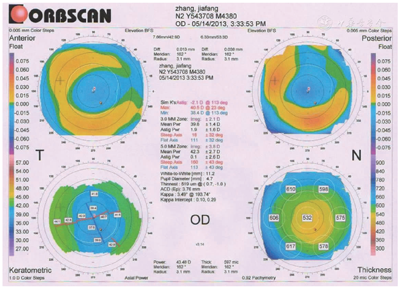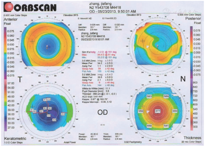 角膜形态规整,角膜后表面高度及角膜最薄点值均在正常范围内