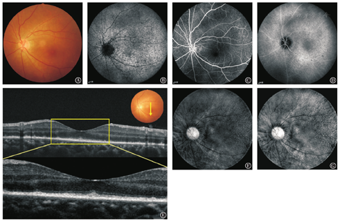 患者,女,39岁,因"左眼视物模糊2周"于2014年7月15日来我院眼科中心就诊。最佳矫正视力(BCVA):右眼0.8,左眼0.3。右眼眼压(IOP)14 mmHg(1 mmHg=0.133 kPa),左眼13 mmHg。双眼外观正常,结膜无充血水肿,角膜透明,前房中等深度,房水清,晶状体密度轻度增高,玻璃体轻度混浊。右眼眼底未见明显异常,左眼眼底视盘边清色正,C/D约0.3,动静脉走行正常,黄斑区反光增强,色素紊乱。眼底彩照示左眼黄斑区散在分布小团块样黄色病灶(见图1A)。眼底自发荧光(autofluorescence,AF,波长为830 nm)示:后极部见弥漫分布点状低荧光(见图1B)。眼底荧光造影(FFA)见后极部弥漫分布小点状低荧光,对应吲哚菁绿造影(ICGA)处亦可见小点状低荧光灶(见图1C-D)。光学相干断层扫描(OCT)示视网膜色素上皮(RPE)层与外层光感受器层之间可见多个小丘样高反射信号物质堆积,同时可见感受器内外节层信号紊乱,部分中断,外界膜完整(见图1E)。多光谱眼底成像(multispectral stratified imaging,MSI,波长在660~850 nm之间)在FFA所示病灶对应处均显示为点状高反射信号区域(见图1F-G)。诊断:视网膜色素上皮炎。入院后完善相关检查,全身炎症及病毒感染指标未见明显异常,给予改善微循环、营养等对症支持治疗。治疗后1个月复诊,左眼视力0.6,OCT示视网膜色素上皮(RPE)层与外层光感受器层之间多个小丘样高反射信号物质堆积已完全消退(见图2A),FFA和ICGA上的病灶范围也较前缩小(见图2B-C)。但MSI仍表现为全视网膜点状高信号病灶,较之前无明显变化(见图2D-E)。