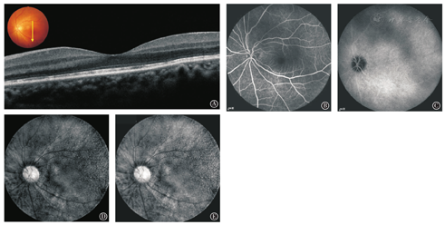 A,OCT示黄斑区视网膜各层结构清晰,中心凹处的团块状物质已全部消失;B,FFA示后极部弥漫点状低荧光;C,ICGA示FFA低荧光对应处可见点状低荧光区,范围及病灶大小较治疗前缩小;D-E,多光谱眼底成像(MSI)示(波长=660、810 nm)FFA对应处仍显示为点状高反射病灶