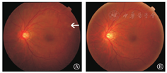 A,首诊时左眼后极部视网膜有类圆形的灰白色病灶(白色箭头所指),病灶间隔视网膜色泽正常,视盘边界清晰,黄斑区中心凹反光点弥散;B,随诊6个月后左眼眼底正常
