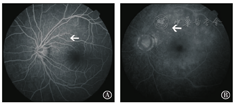 A,FFA显示后极部视网膜散在多发点状高荧光(白色箭头所指);B,FFA晚期显示后极部视网膜荧光着染(白色箭头所指)