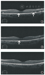 A,首诊时OCT检查显示外界膜层光带信号强度不均匀,局部显示模糊甚至缺损,椭圆体区出现强度减弱和部分区域断裂、消失的现象,视网膜色素上皮层则没有显著的结构改变;B, 3个月后患者复查OCT显示外界膜层光带信号明显,但仍有局部显示模糊,椭圆体区也逐渐清晰(白色箭头所指),但仍有部分区域断裂和消失的现象;C,6个月后复查OCT显示正常黄斑区结构,病变完全恢复
