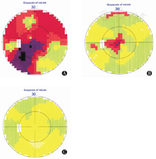 A,首诊时视野检查显示不规则视野缺损;B, 3个月后复查视野显示明显好转,中心视野缺损;C, 6个月后复查视野显示正常