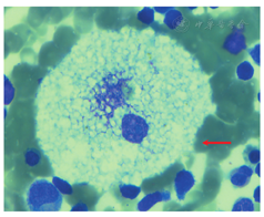 病例1:患儿,男,3岁,因"发现肝脾肿大10个月"入院,无明显不适,发育正常。家族中无类似患者。入院检查:神志清,双肺呼吸音粗,腹软不胀,肝肋下8 cm,脾肋下16 cm,过腹正中线1.5 cm,已入盆;腹部B超提示右叶最大斜径11.4 cm;谷丙转氨酶(Alanine transaminase,ALT)及谷草转氨酶(Aspartate aminotransferase,AST)均升高,分别为71、89 U/L,总胆固醇正常;胸部CT结果显示两下肺渗出;中枢神经系统未见异常;骨髓细胞学检查见典型泡沫细胞,提示尼曼-匹克骨髓象(见图1),根据临床体征,诊断为尼曼-匹克病(Niemann-Pick disease,NPD)B型。眼科检查:患儿固视良好,视力检查欠合作,检影测得屈光度分别为:右眼+2.50-1.50×175,左眼:+2.25-1.00×175。眼前节正常,玻璃体透明,仅眼底检查发现双眼黄斑晕样改变(见图2A-B)。通过代谢类疾病相关基因检测筛查板进行基因测序及疾病数据库分析,报告提示患者SMPD1基因中chr11-6415439处第6外显子发生纯合突变,父母基因检测中发现该位点的杂合突变。