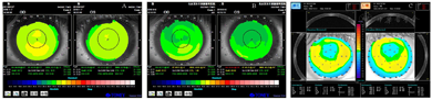 患者1,男,29岁,因双眼近视20余年于2018年1月就诊于北京美尔目润视眼科医院,要求行双眼屈光手术。既往体健,否认慢性病史。术前眼科检查:右眼眼压16.9 mmHg(1 mmHg=0.133 kPa),裸眼视力(UCVA)0.08,最佳矫正视力(BCVA)为-5.75=1.0,角膜厚度574 μm,半暗环境下瞳孔直径5.0 mm,眼底正常。左眼眼压17.6 mmHg,UCVA为0.08,BCVA为-5.00-0.50×70=1.0,角膜厚度570 μm,半暗环境下瞳孔直径5.0 mm,眼底正常。双眼角膜地形图正常,见图1A。诊断:双眼屈光不正。治疗:双眼表面麻醉下行飞秒激光小切口角膜基质透镜取出术(SMILE),术程顺利。术后第1天复查,右眼UCVA 0.5,左眼0.8;右眼BCVA为-2.25-0.75×25=1.0,左眼-0.75-0.50×25=1.0;双眼角膜无异常变化。术后1个月复查,右眼UCVA为0.4;左眼0.5;右眼BCVA为-2.50-0.75×25=1.0;左眼-1.00-0.50×25=1.0;双眼角膜无异常变化。术后6个月复查UCVA、BCVA无变化,角膜无异常,右眼剩余基质厚度410 μm,左眼394 μm,见图1B。