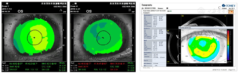 患者2,女,33岁,因双眼近视20余年于2018年2月就诊于北京美尔目润视眼科医院,要求行双眼屈光手术。既往体健,否认慢性病史。术前眼科检查:右眼眼压17.9 mmHg,UCVA为0.12,BCVA为-2.50-0.50×60=1.0,角膜厚度619 μm,半暗环境下瞳孔直径6.0 mm,眼底正常。左眼眼压17.2 mmHg,UCVA为0.12,BCVA为-2.75=1.0,角膜厚度629 μm,半暗环境下瞳孔直径6.0 mm,眼底正常。双眼角膜地形图正常,见图2A。诊断:双眼屈光不正。治疗:双眼表面麻醉下行SMILE,术程顺利。术后第1天复查,右眼UCVA为1.2,左眼0.4;左眼BCVA为0.5-1.75×85=1.0,角膜无异常变化。术后1个月复查,右眼UCVA为1.2,左眼0.4;左眼BCVA为-1.75×85=1.0,角膜无异常变化。术后6个月复查UCVA、BCVA无变化,角膜无异常,左眼术后剩余基质厚度461 μm,见图2B。