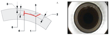 A:手术方案设计图。1:板层环和侧切口的外径;2:板层环和侧切口的深度;3:侧切角;4:接合切口的直径;5:接合切口的上端深度;6:接合切口的下端深度。B:手术方案完成图