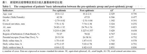 本研究的主要目的是通过对比COVID-19疫情前后1年内儿童近视者等效球镜度(SE)、眼轴(Axial length,AL)、眼轴角膜曲率比值(Axial/corneal curvature ratio,AL/CR)的变化,探讨COVID-19疫情爆发后近视儿童患者用眼状况的改变对近视进展的影响。