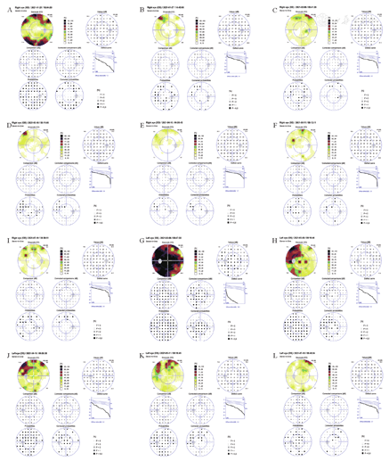 A:甲泼尼龙500 mg冲击治疗3 d右眼视野检查(2021-01-21);B:甲泼尼龙减量至120 mg治疗3 d右眼视野检查(2021-01-27);C:甲泼尼龙减量至56 mg治疗1周右眼视野检查(2021-02-06);D:甲泼尼龙减量至40 mg治疗2周右眼视野检查(2021-03-06);E:甲泼尼龙减量至16 mg治疗3周右眼视野检查(2021-04-10);F:甲泼尼龙16 mg治疗2个月右眼视野检查(2021-05-11);G:甲泼尼龙16 mg治疗4个月右眼视野检查(2021-07-10);H:甲泼尼龙减量至56 mg治疗1周左眼视野检查(2021-02-06);I:甲泼尼龙减量至40 mg治疗2周左眼视野检查(2021-03-06);J:甲泼尼龙16 mg治疗3周左眼视野检查(2021-04-10);K:甲泼尼龙16 mg治疗2个月左眼视野检查(2021-05-11);L:甲泼尼龙16 mg治疗4个月左眼视野检查(2021-07-10)