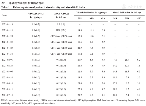 患者,女,56岁,因"左眼疼痛伴视力下降5 d"于2021年1月19日至南通市第一人民医院眼科就诊。患者自诉2012年因双下肢无力至复旦大学附属华山医院就诊,诊断为脊髓炎,病程中予以地塞米松磷酸钠抗炎治疗(具体剂量不详),双下肢无力好转。现患者双上肢肌力5级,双下肢肌力2级(肌力的六级记录法[1])。眼科专科检查示:右眼裸眼视力0.2,左眼光感(双眼矫正无提高);眼压:右眼眼压为20 mmHg(1 mmHg=0.133 kPa),左眼为21 mmHg;右眼光反射正常,左眼光反射迟钝,相对性传入性瞳孔功能障碍(Relative afferent papillary,RAPD)(+),散瞳后眼底未见异常。查视觉诱发电位(Visual evoked potential,VEP)示:右眼P100的潜伏期及振幅正常,左眼P100波形未引出。光学相干断层扫描(OCT)未见异常。头颅核磁共振成像(MRI)未见异常。颈椎MRI示:胸椎术后改变,局部脊髓变细移位,颈椎胸椎退行性改变。患者免疫球蛋白、甲状腺激素及甲状腺功能自身抗体检查未见异常。初步拟诊为:左眼视神经脊髓炎谱系疾病(Neuromyelitis optica spectrum disorders, NMOSD)。治疗方案:2021年1月19日起予以银杏达莫(贵州益佰制药)25 ml,静脉滴注,1次/d,连续12 d,以改善微循环;甲钴胺(瑞阳制药)2 mg,静脉滴注,1次/d,连续12 d,以营养神经;甲泼尼龙(比利时辉瑞制药)500 mg,静脉滴注,1次/d,连续5 d冲击治疗。2021年1月21日,患者眼底荧光素血管造影(FFA)示双眼后极部散在点状荧光;吲哚青绿血管造影(ICGA)示双眼脉络膜血管高通透,晚期斑片状弱荧光。治疗方案:给予螺内酯片(江苏正大丰海制药)每次20 mg,口服,2次/d,以改善脉络膜血供。2021年1月24日起甲泼尼龙减量至每次250 mg,静脉滴注,1次/d,连续3 d,且每连续治疗3 d后甲泼尼龙予以依次减半治疗。2021年1月25日,患者行脑脊液常规、脑脊液免疫球蛋白检查未见异常,脑脊液生化测定结果示:葡萄糖4.96 mmol/L(2.5~4.5 mmol/L);乳酸3.30 mmol/L(参考值:1.19~2.09 mmol/L)。2021年1月26日,血清液抗水通道蛋白4(Aquaporin 4,AQP4)抗体IgG示1:1000(强阳),抗少突胶质细胞糖蛋白(Myelin oligodendroeyte glycoprotein,MOG)抗体IgG阴性,抗髓鞘碱性蛋白(Myelin basic protein,MBP)抗体IgG阴性;脑脊液抗AQP4抗体IgG示1:32(弱阳),抗MOG抗体IgG阴性,抗MBP抗体IgG阴性。复查视野示右眼视野缺损较前好转。重新诊断:双眼NMOSD。治疗方案:给予吗替麦酚酯胶囊(上海罗氏制药)每次0.5 g,2次/d,长期口服。患者2021年1月30日出院,予以甲泼尼龙(天津天药公司)每次56 mg,1次/d口服,每2周依次减8 mg至维持剂量16 mg,吗替麦酚酯胶囊每次0.5 g,2次/d口服。复查血常规、肝肾功能均未见明显异常。患者视力、视野均较前明显改善(见表1和图1),VEP示右眼正常,左眼P100波形峰时延迟、振幅降低。