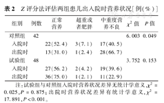 对照组及试验组中、高营养风险的发生比例差异无统计学意义(χ2=0.025,P=0.875)。见表1。