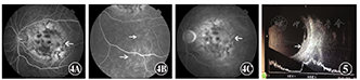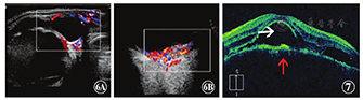 患者,女,42岁。2015年9月因左眼视物不清1个月于沧州市中心医院就诊,左侧颜面部可见血管瘤(图1)。眼科检查:视力右眼1.0,左眼0.1,右眼前后节未见异常,左眼鼻侧球结膜血管迂曲扩张,颞侧球结膜表面可见肿物,突出于眼表(图2),角膜透明,晶状体无明显混浊,玻璃体检查未见明显异常,眼底检查可见黄斑区类圆形橘黄色隆起,大小约为4个视盘直径(papillary diameter,PD)(图3)。颅脑CT未见异常;荧光素眼底血管造影(fundus fluorescein angiography,FFA)显示左眼静脉期黄斑区脉络膜高低荧光相间,病灶下方可见点片状高荧光,晚期黄斑区及其下方荧光素稍渗漏(图4);眼部B型超声检查显示左眼球壁局限性卵圆形隆起,突向玻璃体腔,表面光滑,内回声均匀,中等强度,其边缘可探及带状回声(图5);眼部彩色超声检查显示左眼颞侧靠近球壁可见一囊性结构,形态规则,其内呈现液性区,内透声可,彩色多普勒血流显像(color doppler flow imaging,CDFI)示其内未见血流信号,视盘颞侧可见一偏强回声,内部回声均匀,其内可见丰富血流信号,该处视网膜稍隆起,并可见一带状回声与之相连(图6);OCT显示黄斑区脉络膜及其上结构高度隆起,相应处视网膜神经上皮层浆液性脱离,层间水肿,视网膜色素上皮(retinal pigment epithelium,RPE)/脉络膜毛细血管光带不完整(图7)。诊断:斯特奇-韦伯综合征(Sturge-Weber syndrome,SWS)。
