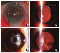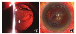 例1,女,72岁。因右眼视物模糊6个月就诊于内蒙古自治区人民医院眼科。患者1年前曾在内蒙古自治区人民医院眼科行右眼白内障超声乳化联合人工晶状体植入术,术中植入亲水性丙烯酸酯人工晶状体(intraocular lens,IOL),术后3 d术眼矫正视力1.0。6个月前患者自觉右眼视物模糊,无明显诱因,未治疗。眼科检查:右眼视力0.2,矫正后视力不提高,眼压16 mmHg(1 mmHg=0.133 kPa)。右眼外眼未发现异常,角膜透明,前房深度中等,晶状体前囊膜皱缩,囊袋口缩小,IOL襻蜷缩,IOL偏心、移位,眼底隐约可见视盘边界清,色泽正常,视网膜平伏,余窥不清(图1,图2)。左眼检查未见明显异常。初步诊断:右眼晶状体囊袋皱缩综合征(capsule contraction syndrome,CCS)。行右眼晶状体前囊膜环形剪除术,解除IOL的蜷缩及偏心、移位(视频)。术后3 d患者右眼视力1.0,眼部手术伤口愈合,出院(图3,图4)。