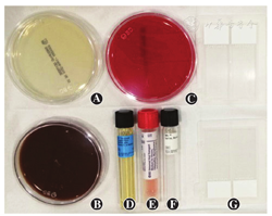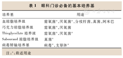角膜溃疡刮出物培养和涂片是分离致病菌的主要手段,一般是在眼表面麻醉后在裂隙灯显微镜下进行操作。质量分数0.5%盐酸丙美卡因因其抑菌效应低而作为首选表面麻醉药,其他表面麻醉药会明显降低细菌的回收率和检查的阳性率,有时药物中的防腐剂也会影响检出结果。取材时应从感染灶的进展边缘反复刮取组织以获得最高检出率,仅刮取脓性分泌物是不够的。刮取工具包括无菌棉签、刀片、尖镊子和针头等,取材后立即直接接种到培养皿表面或培养液中。获取的样本最少应制备2张涂片,用于基本的革兰和吉姆萨染色。革兰染色最适用于细菌种类的鉴别,但也可以显示真菌及阿米巴,而吉姆萨染色则适合鉴别细菌、真菌、衣原体及阿米巴。总体上,通过病原检查成功鉴定病原菌的机会约为50%。眼科门诊应该常备的基本培养基及其适用范围见图1及表1。