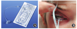 初选的抗生素药物治疗是否有效一般至少要24 h以后方能做出判断,有时由于感染严重,用药48 h后病情仍不见好转,应考虑其他病原微生物感染的可能,有必要重新刮取溃疡边缘组织进行培养,同时应考虑进一步增加感染组织中的有效药物浓度,同时将点眼频率增至每10~15 min 1滴,但临床上这种用药方法不宜持久。有报道提到上眼睑结膜囊内留置输液管做抗生素的眼表连续灌注可达到控制顽固性感染的效果[9],但全层切开上眼睑,对眼睑组织创伤较大,会遗留瘢痕,甚至影响提上睑肌功能。近几年,我们尝试用摩根镜置于双眼睑下进行抗生素持续灌注给药的方法治疗严重、顽固性的眼表感染,包括铜绿假单胞菌角膜炎,收到了很好的效果[10]。摩根镜常是用于眼表异物冲洗或眼表酸碱化学伤后盥洗的装置[11],美国绝大多数急诊室都有备用,其形状类似一个反置的漏斗,尖端连接输液管,放置容易且无需手术,节省人工,给药速度可通过输液泵进行调节,易普及和应用(图2)。从目前的临床经验看,应用该镜15 d以内尚未见不良反应发生。通过输液管可在不同时间段采用不同药物进行治疗,有望完全覆盖可能的致病菌。除了增加给药浓度外,利用摩根镜持续灌注还能不断冲掉坏死组织,可能会有预防或破坏致病菌产生的生物膜的作用。生物膜的形成往往会阻断抗生素与致病菌的接触,影响药物的杀菌效果。如果感染已造成角膜穿孔,直径小于2 mm的穿孔可用氰基丙烯酸酯组织胶加绷带镜修补,以暂时维持眼球的完整性。因为感染中的角膜炎症严重,此时紧急实施角膜移植术排斥率很高,应尽量避免。待感染得到根治,炎症明显控制后再择期行角膜移植术治疗角膜白斑,以增加角膜植片成活率。3 mm以上的角膜穿孔需要行羊膜、结膜下筋膜或结膜瓣修补术,手术若不成功则行紧急角膜移植术。因为新鲜供体角膜来源不易,进行紧急角膜移植时最好采用在乙醇或甘油内长期保存的非活性角膜植片。手术中切除的组织要送病理检查复核,术后要继续治疗并且密切观察感染复发的迹象。