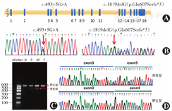 采集患者及其父母外周血,提取DNA进行全外显子测序,结果显示患者HGSNAT基因(NM_152419.2)发生c.493+5G>A和c.1819delG(p.Glu607Serfs*3)变异(图2A、B),分别来自于母亲和父亲,这2个变异在公共人群数据库中均无基因变异频率数据。提取患者及其父母外周血RNA,逆转录PCR扩增,对扩增产物进行琼脂糖凝胶电泳和Sanger测序证实c.493+5G>A变异导致了异常剪切,造成该基因整个外显子4跳跃,外显子3和5连接并转录,患者和其母亲同时检测到野生型和变异型RNA(图2C、D)。依据ACMG变异分级,判定该病例HGSNAT基因变异均为致病性。患者晨尿甲苯胺蓝试验显示弱阳性,提示尿液中有过量的酸性黏多糖。结合临床表现,最终诊断为常染色体隐性遗传综合征性RP。