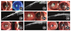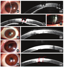 例1,患者,男,51岁,2021年9月30日因左眼溅入铁屑后眼红、眼痛伴视力下降于当地医院就诊,予以左眼角膜异物取出术及左氧氟沙星滴眼液点眼治疗后症状好转。2021年10月20日患者再次出现左眼红痛、流泪、视物模糊,至南京医科大学附属眼科医院就诊。眼科检查:裸眼视力左眼0.12,右眼1.0。裂隙灯显微镜下可见左眼角膜中央偏鼻下方约1.5 mm×2.0 mm灰白色溃疡灶,深达基质层,溪流征(+),周边前房近消失,瞳孔直径约3 mm,对光反射迟钝,晶状体轻度混浊,眼底窥不清(图1A)。光学相干断层扫描(optical coherence tomography,OCT)检查显示角膜坏死组织覆盖在角膜穿孔处,呈楔形(图1B)。右眼未见明显异常。诊断:左眼角膜异物取出术后;左眼角膜溃疡穿孔。患者入院后应用头孢他啶注射液2 g静脉滴注1次/d,加替沙星滴眼液、妥布霉素滴眼液1次/h及加替沙星眼膏、妥布霉素眼膏每晚1次点左眼,并加压包扎。治疗后3 d左眼角膜穿孔未愈合,前房仍未形成,于2021年10月26日行左眼羊膜填塞术。术中于显微镜下彻底清除溃疡区坏死组织,于穿孔处向前房内注入黏弹剂,取2 mm×4 mm眼科用湿性生物羊膜(瑞秀复®,广州瑞泰生物科技有限公司)卷成羊膜塞填塞于穿孔处,用10-0尼龙线呈十字形将羊膜卷缝合于角膜穿孔处,另取单层湿性生物羊膜上皮面朝下覆盖于角膜溃疡表面,其尺寸(直径约5 mm)大于溃疡面1.5~2.0 mm,用10-0尼龙线间断缝合于角膜,角膜缘注入复方氯化钠注射液置换前房黏弹剂,检查角膜水密性,确保前房形成,术后佩戴软性角膜接触镜。术后1 d,左眼视力数指/眼前,表层羊膜和羊膜卷贴附平整,前房形成良好,羊膜植片在位,穿孔区密闭良好;术后3 d,左眼视力0.06,单层羊膜开始溶解,角膜上皮及穿孔区基质组织逐渐生长;术后20 d,左眼视力0.1,羊膜卷与周边组织愈合良好,穿孔区角膜上皮愈合,基质层在羊膜卷支架作用下进一步修复,角膜厚度增加;术后3个月,左眼视力0.3,羊膜卷与周边组织愈合良好(图2~5)。