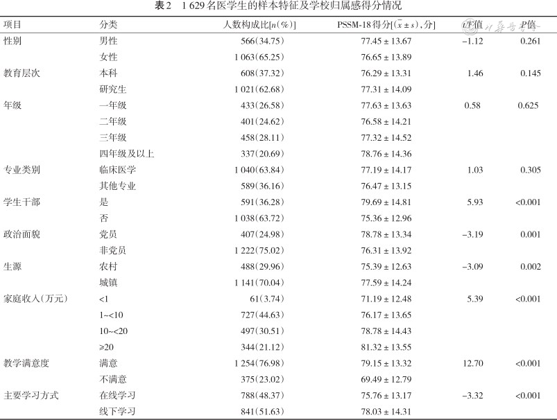 经单因素分析发现,学生干部、党员、城镇生源和高家庭收入学生的归属感得分较高;近期以线上学习为主及对当前教学情况不满意的学生,其学校归属感得分较低。不同类型医学生的PSSM-18得分情况详见表2。